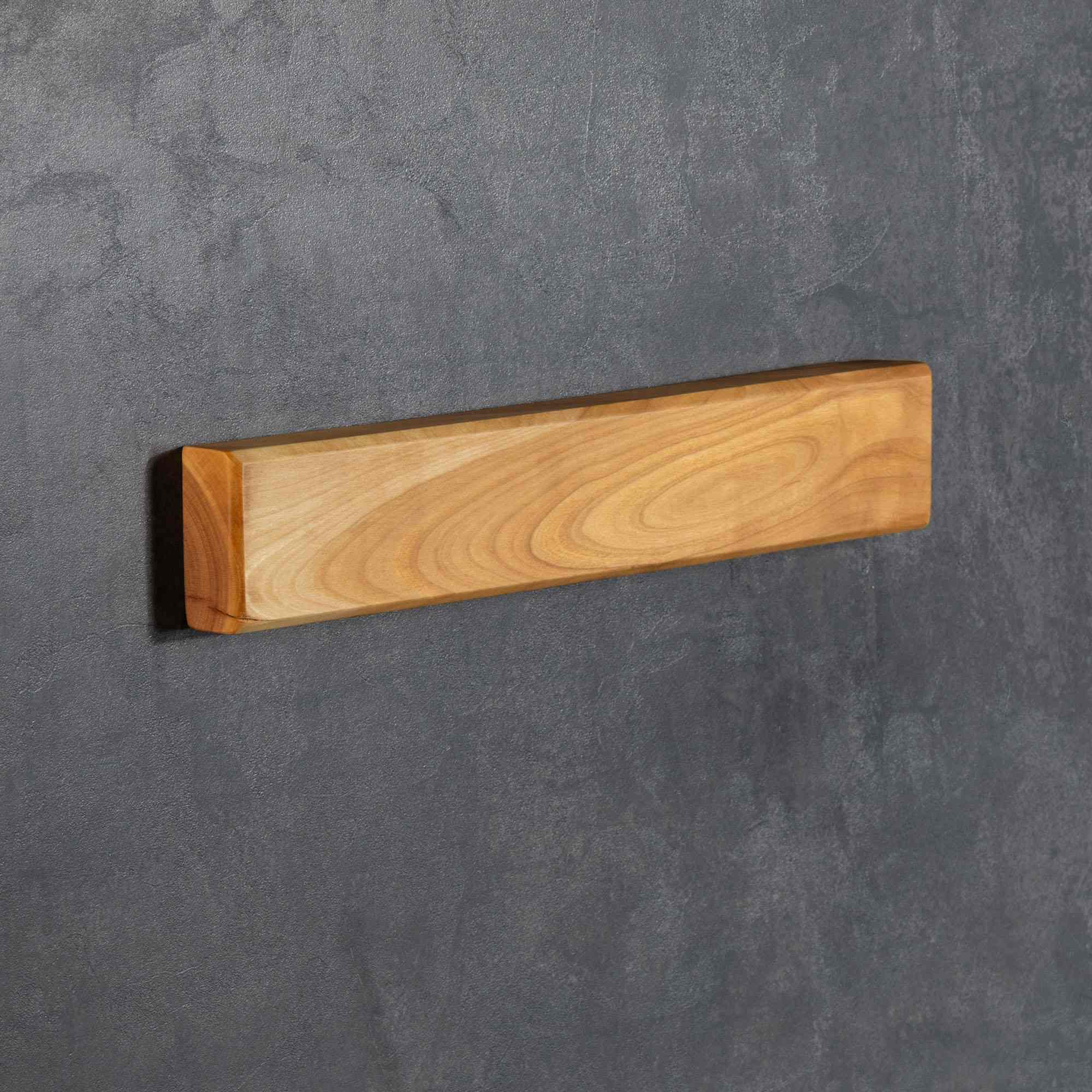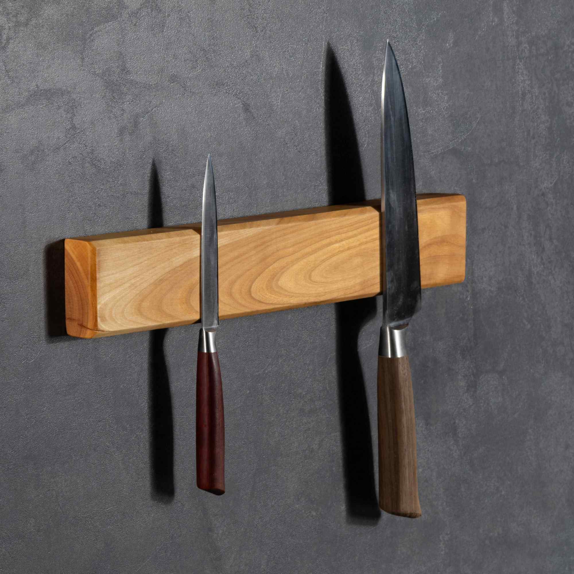 Bringe Ordnung und Stil in deine Küche, mit unserer handgefertigten magnetischen Messerleiste aus Kirschholz! So dienen deine Küchenmesser wunderbar als Stilelement in deiner Küche und sind gleichzeitig griffbereit in deiner Nähe. Zusätzlich ist diese Art der Messeraufbewahrung Klingen schonend und herrlich platzsparen. Die kraftvollen Neodym Magnete sind hinten in der magnetischen Messerleiste eingelassenen und halten auch größere Messer sicher an ihrem Platz. Die Holzleiste selbst ist einfach und unsichtbar mit nur zwei Schrauben in der Wand zu montieren. Du möchtest die Magnetleiste lieber ohne bohren anbringen? Kein Problem, wähle einfach die Option selbstklebend. Passend zu deiner Küche, kannst du die Länge der magnetischen Messerleiste auswählen. Die Magnete sind in einer Reihe eingelassen, dadurch können die Messer frei angeordnet werden.