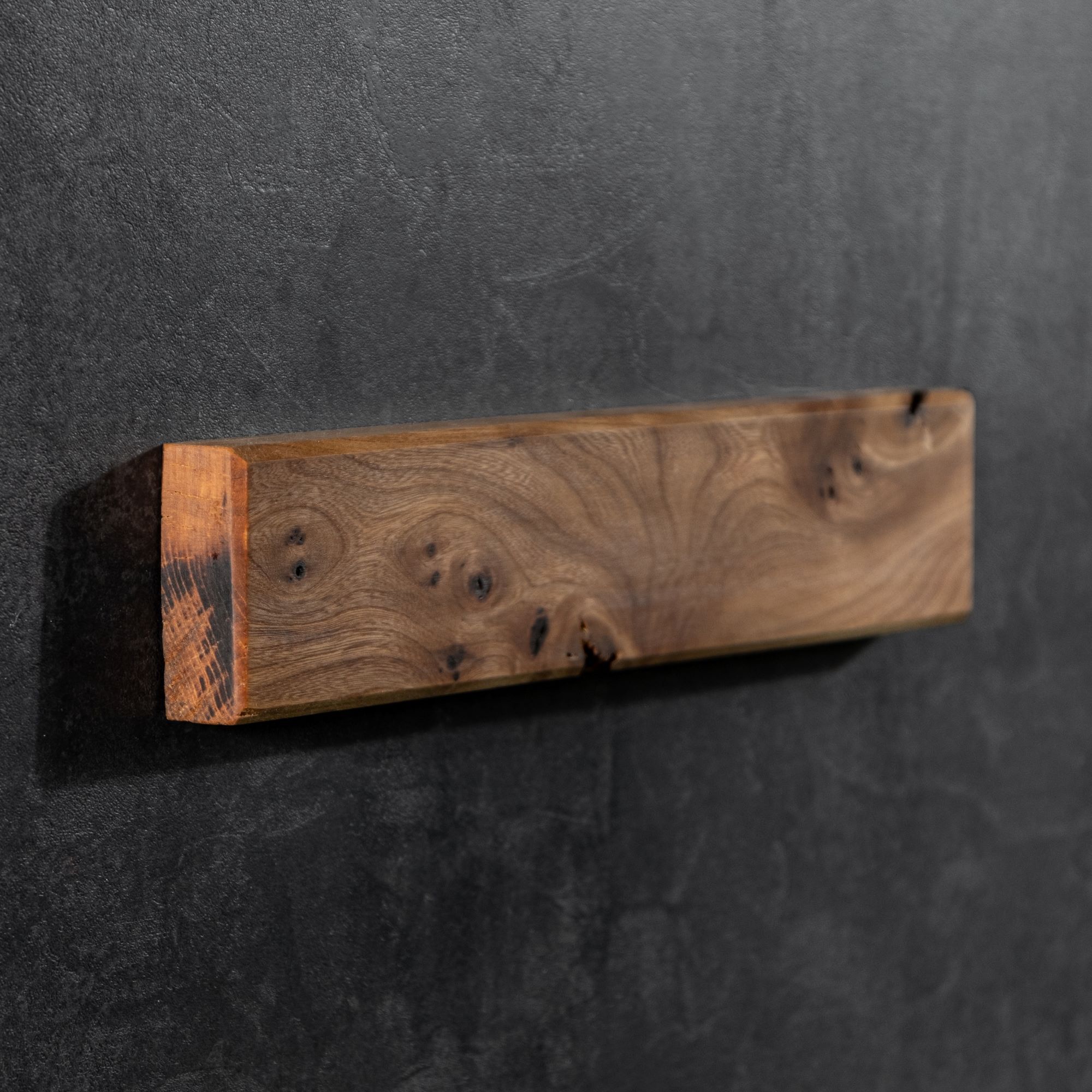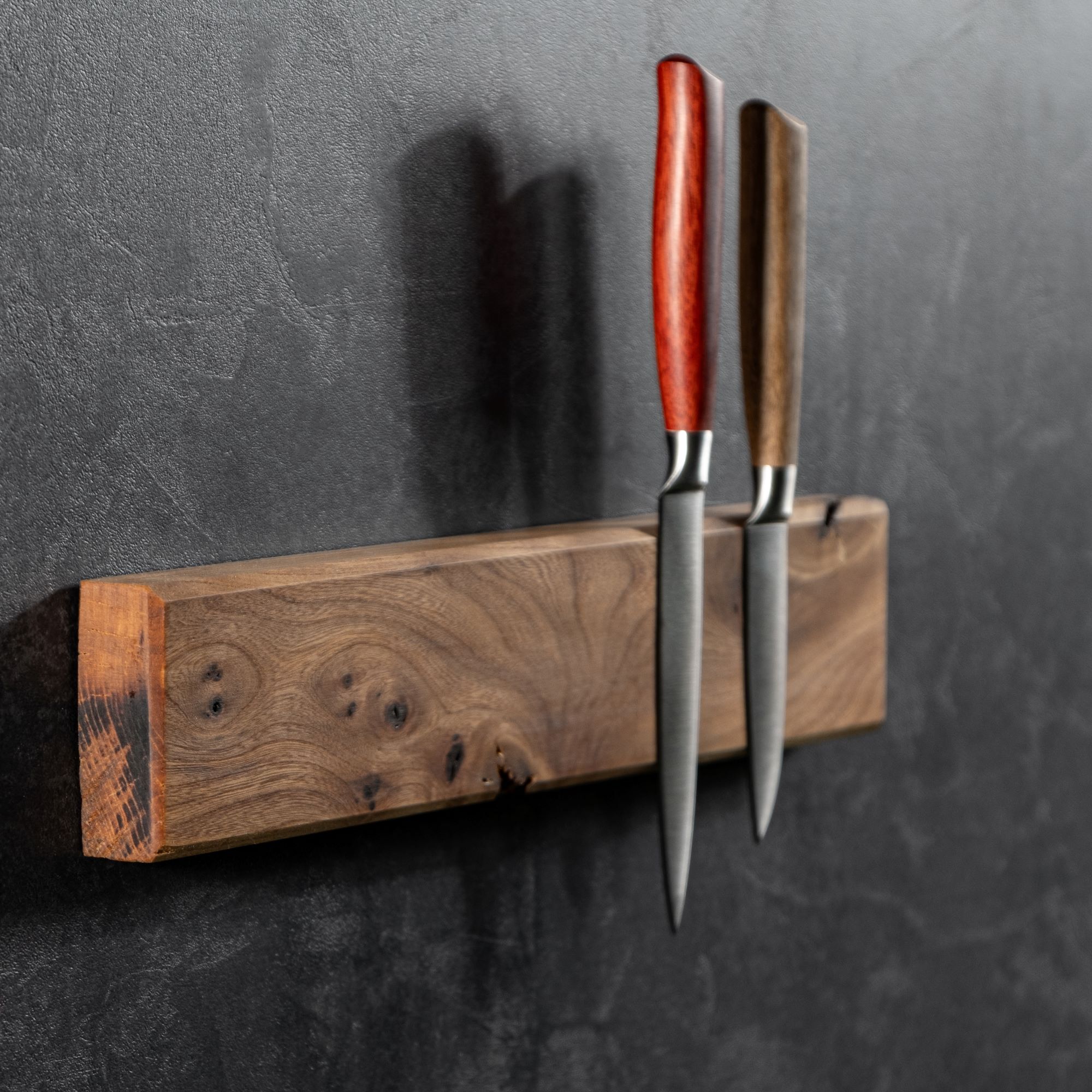 Bringe Ordnung und Stil in deine Küche, mit unserer handgefertigten magnetischen Messerleiste aus Maserulmenholz! So dienen deine Küchenmesser wunderbar als Stilelement in deiner Küche und sind gleichzeitig griffbereit in deiner Nähe. Zusätzlich ist diese Art der Messeraufbewahrung Klingen schonend und herrlich platzsparen.