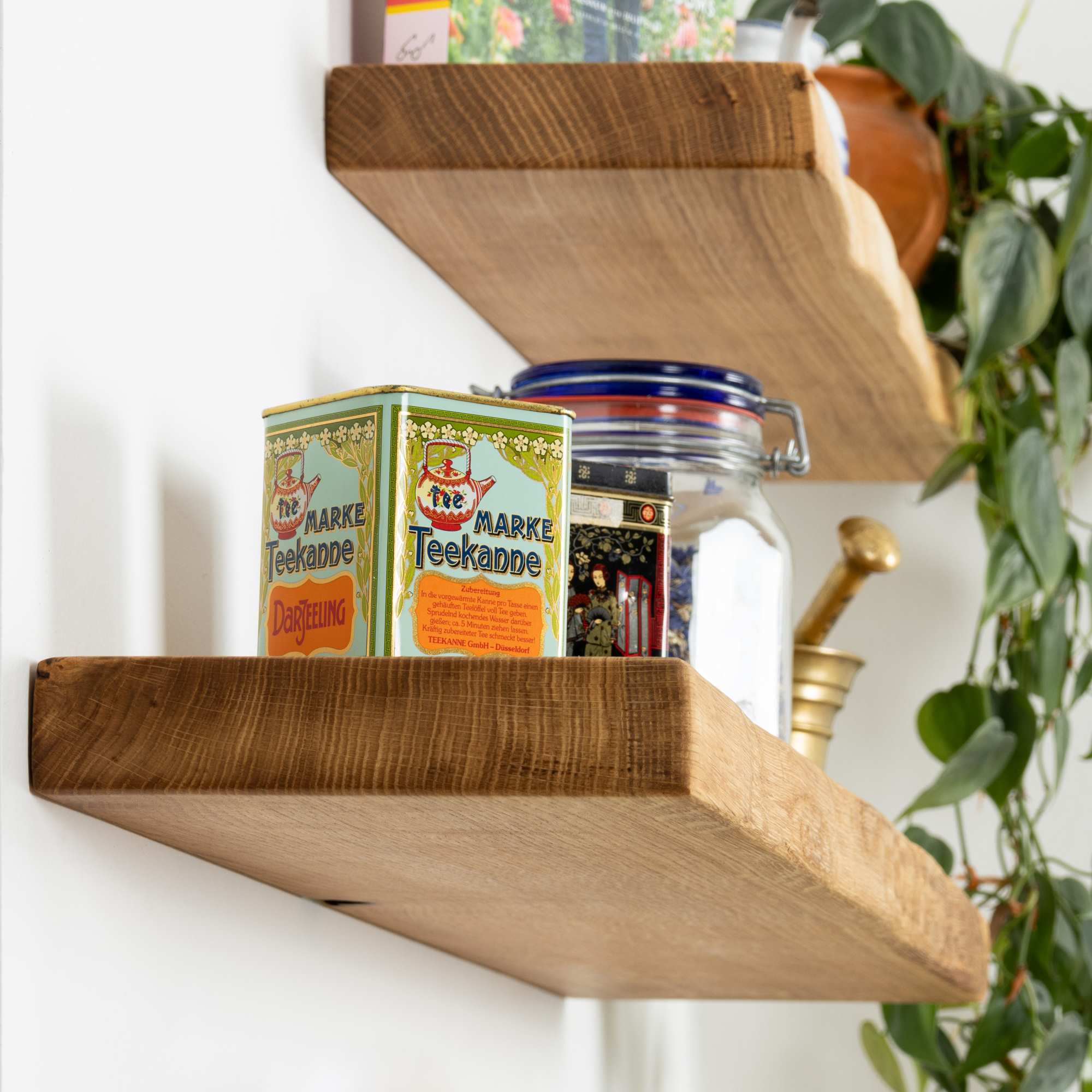 Modern mit gerader Kante, oder lieber rustikal mit natürlicher Baumkante. Im Bad, der Küche, oder dem Wohnzimmer, egal wo, schaffen die praktischen Wandboards einen gemütlichen Flair. Das schwebende Wandregal Eiche besitz normalerweise eine Brettstärke von 2,5 oder 4cm. Auf Wunsch können wir die Regalbretter aber auch in einer anderen Stärke anfertigen. Die Länge und Tiefe der Eichenholz Regale kannst du passend zu Deinem Raum oben auswählen. Die Art der Kante, buchst du nach Belieben bei den Zusatzoptionen darunter. Die Oberfläche der Wandregale behandeln wir mit natürlichem Holzöl. Dieses schützt das Holz, betont die Maserung und lässt die Farben leuchten. Auf Wunsch kannst du die Regalbretter aber auch unbehandelt erwerben. Halterungen und Befestigungsmittel sind selbstverständlich im Lieferumfang begriffen. Du hast eine Trockenbauwand? kein Problem, schreib es mit in die Bestellung und wir liefern dir passende Dübel mit.